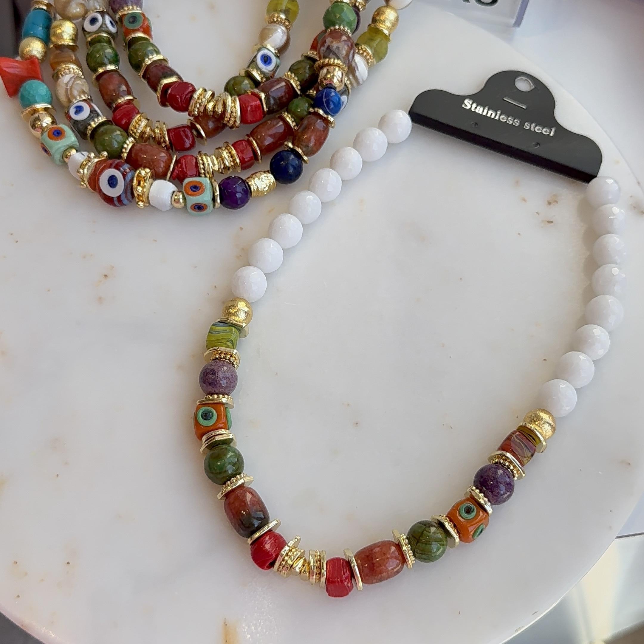 Beyaz Boncuk Kombinli İri Doğal Taş Kolye