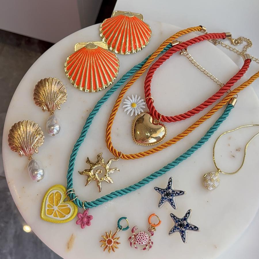 “Yazın en renkli hali takılarımızda! 🍋🌞🦀 Deniz kabukları, yıldızlar, kalpler ve tropik detaylarla dolu bu koleksiyonla tarzına neşe kat!